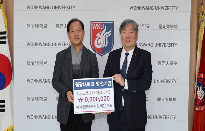 노회은 유한회사 대진엔지니어링 대표가 원광대학교 글로컬대학펀드 조성 및 교육역량 제고를 위한 발전기금 1,000만원을 지난해에 이어 올해도 기탁했다.